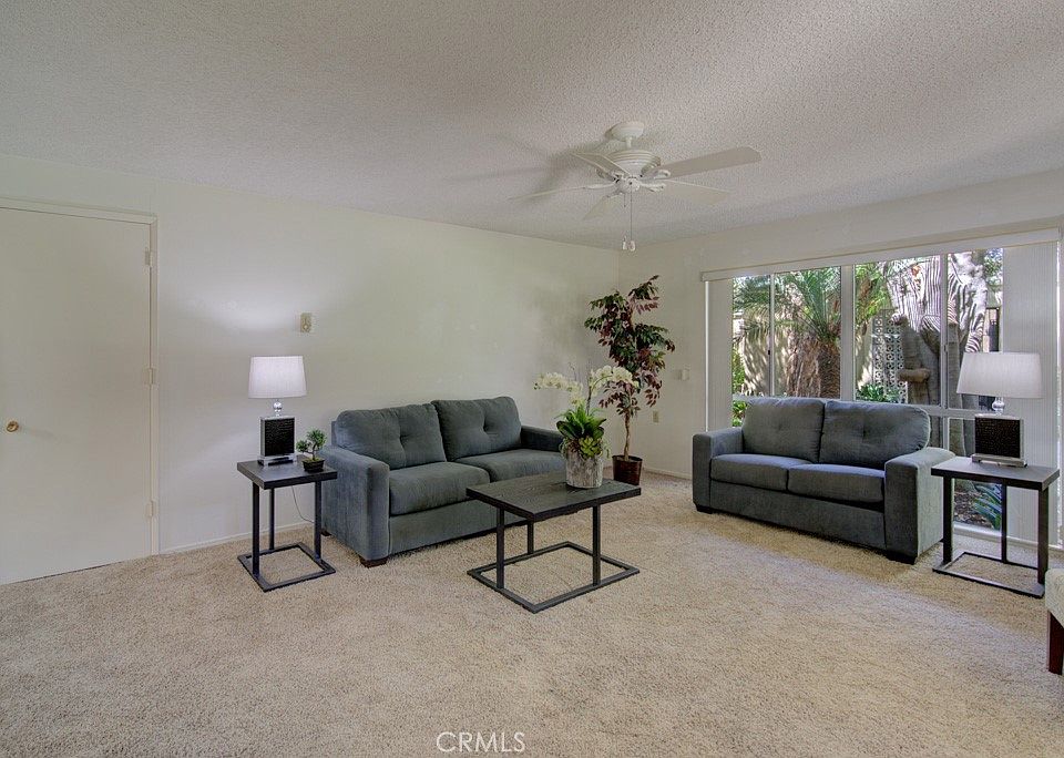 GROUND FLOOR - Popular CADIZ model with two steps from the sidewalk and no steps from the patio to enter this spacious property. Nestled on a lush greenbelt in a quiet cul de sac. All the appliances belong to and are maintained by the HOA. There's a heat pump in the living room to economically heat in the winter and cool in the summer. A ceiling fan has also been installed in the living room. Newer neutral tone plush carpet in the living room, dining room and bedroom and vinyl in the bathroom and kitchen. The bathroom has a tub with a shower over the tub and tub enclosure. The private patio and large living room window overlook the greenbelt. There's plenty of guest parking near the unit. Just steps to the carport and laundry. Laguna Woods residents enjoy 5 swimming pools, 7 clubhouses, 2 gyms, craft studios, 2 gorgeous golf courses (27 hole and 9 hole par 3), over 250 social clubs, performing arts theater, tennis courts, equestrian trails, stable, fare free bus service, golf cart paths, manned security gates, lawn bowling, bocce ball, pickle ball and much more. All this located near beautiful Laguna Beach, shopping malls, medical services, hospitals, and the 5 freeway. THIS IS THE ONE YOU'VE BEEN WAITING FOR.