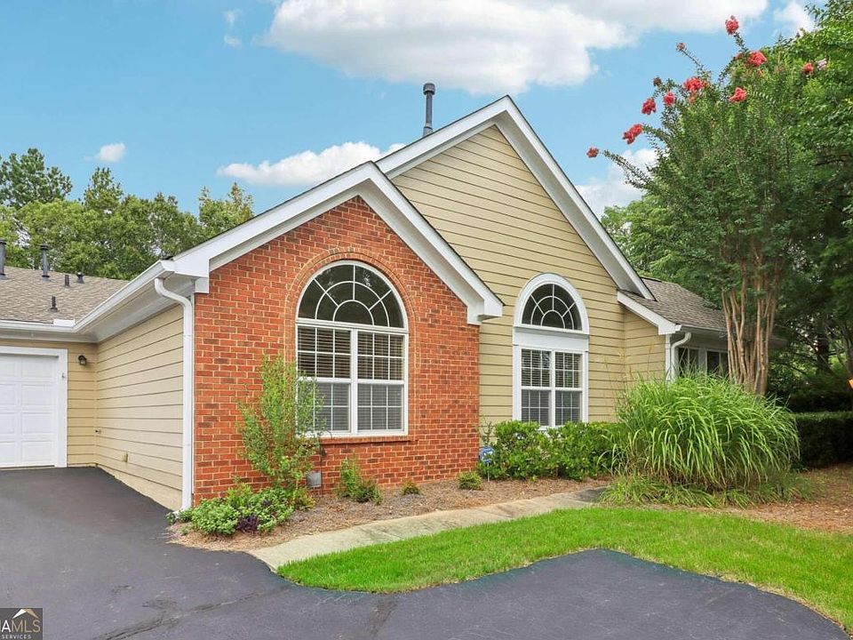 Lovely move-in ready single story home with plenty of room to spread out in the popular The Vintage Club where all your exterior maintenance needs are handled by the HOA. No more yardwork! Step inside to soaring vaulted ceilings in the spacious open concept living room. The light filled room has a cozy fireplace and beautiful and easy-to-maintain laminate wood floors. Dining area leads into the kitchen featuring a breakfast bar, tile backsplash, and plenty of cabinet and counter space. Retreat to the primary suite with a huge window and en-suite bath with dual sinks, vanity seating, walk-in shower, and large walk-in closet! Second bedroom on the opposite end of the house offers the ultimate in privacy with a full bath with a fully tiled shower/tub combo close by. An office/living room/formal dining room has french doors to close off from the living room. Also enjoy a large sun room with walls of windows and french doors for a cozy reading nook, craft space, you name it! Out back, lush grounds give privacy with wooded views. Enjoy convenience and style with this home minutes away from major roadways, Town Center Mall, Kennesaw State University, entertainment, parks and recreation! With an active social committee with monthly activities and pool, gym, library and clubhouse, this one has it all. Schedule your tour today!