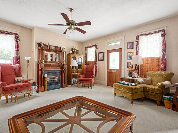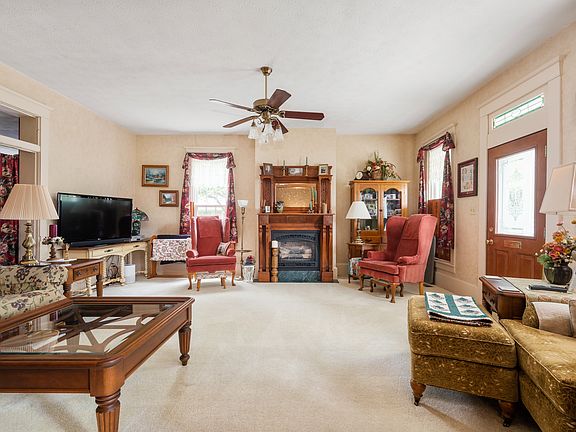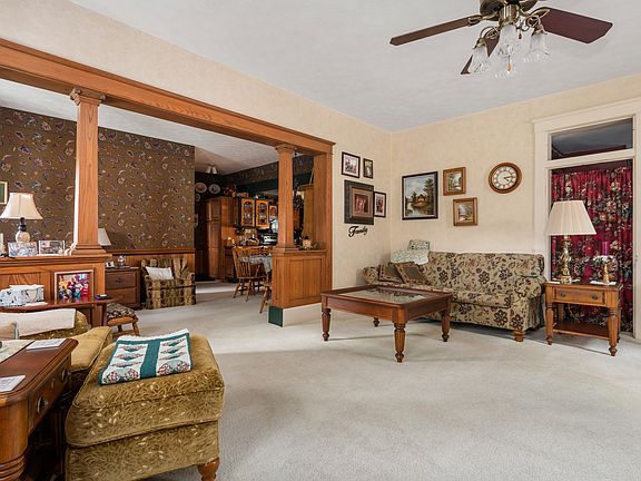Sitting on a beautiful corner lot, this home has been very well cared for over the years. So much charm, including original woodwork, beautiful gas fireplace, and built-in book shelves. Modern amenities such as the addition of a primary suite with vaulted ceiling and a walk-in closet. Custom kitchen boasts cherry cabinets, an island, and plenty of storage including a built-in 36" pantry with rollout trays, and all appliances stay. Enjoy spending time on both porches! The front porch has newer composite decking and a perfect spot for a porch swing. In the back is an enclosed 4-season porch which allows for extra space to entertain or take an afternoon nap. The two-car attached garage has attic access for upper storage.