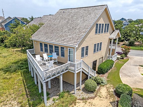 This four bedroom and three full bath home is a fairly new renovated home in the sound side Ridges community of the Village at Nags Head. You will enjoy views of the Nags Head Golf Links Golf Course, stunning sunsets and even a glimpse of the Albemarle Sound and Pond. The tastefully furnished interior is of neutral colors and coastal-inspired décor and will give you that relaxed feeling as soon as you walk inside. Vaulted ceilings and an abundance of natural light give the living room a bright and airy feel. Stylish and beach-friendly LVP flooring runs throughout the common areas, and a large deck off the great room is perfect for sunbathing or watching the golfers T off. After a day at the beach or exploring The Outer Banks, come home and curl up on the sofa in front of the gas fireplace. When you're not dining out at one of Nags Head's fabulous restaurants, prepare meals at home in the updated kitchen with granite countertops and stainless steel appliances. At the end of the night, retreat to the luxurious primary suite with custom tiled shower. Three more bedrooms and a third full bath are located upstairs, providing plenty of space for family and friends. Membership is availabe to the Village Beach Club and Golf Links for owners. Those Amenities include an oceanfront 5,000 sq ft Olympic-sized pool, free paprking, kiddie pool, lifeguarded beach access, restroom and shower facilities, tennis courts, and a snack bar/cafe with a full-service bar that also serves lunch. The Village Beach Club is a one-stop, everything-you-need destination for a full day of fun in the sun for the entire family. A membership for the golfers can take advantage of discounts at the Nags Head Golf Links, a challenging Scottish course named "among the most beautiful in the Eastern US" by Golf Digest. Situated at milepost 14 in Nags Head this home is only half a mile to the beach. Take a ten-minute walk or four-minute bike ride to the Epstein public access (there's also plenty of free parking). Just a mile south in the opposite direction you'll find the Outer Banks Mall which includes grocery stores, home décor and boutique shopping, plus a variety of dining and take-out options. Bring your kayaks or standup paddleboards and launch them at the nearby sound access for a fun day on the water.