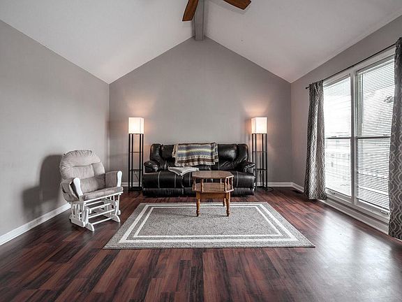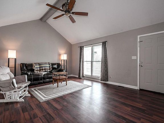 Three bedroom two bath home in the heart of La Grange located within walking distance to downtown La Grange and just down the street from neighborhood park! Home is also in the award winning Oldham County school district. Enjoy morning coffee on your front porch overlooking private cul-de-sac location. Laminate flooring in vaulted great room, down hall and master bedroom. Eat in kitchen overlooks deck and large backyard. Separate laundry room with additional storage. All bedrooms are good sized and front 2 bedrooms are serviced by full hall bath. Master Bedroom has walk in closet and private full bath. New roof and newer HVAC system plus some fresh carpet and paint make this home move in ready. Shed on rear of property remains as a convenience to buyers and has little to no value.