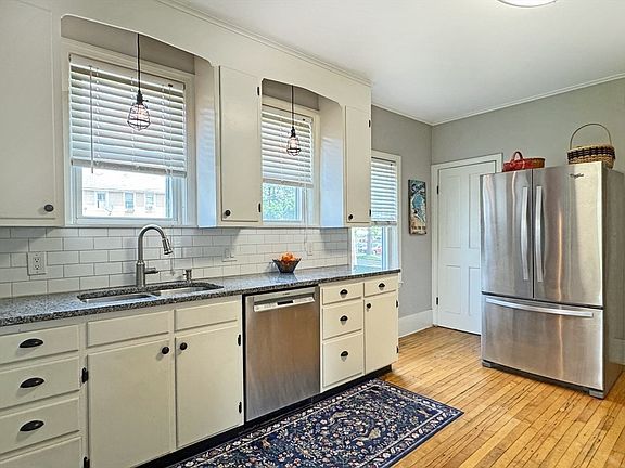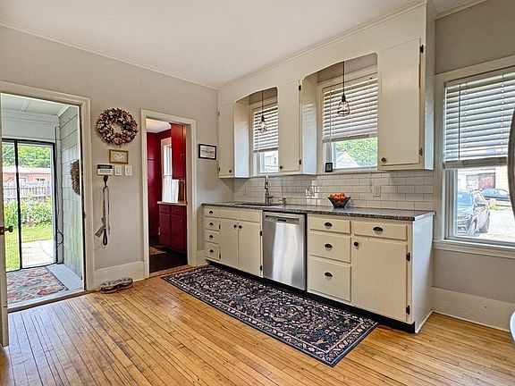 All the conveniences of in-town living with the beauty and serenity of a hidden gem in the outdoor spaces of this much loved and beautifully maintained Turn of the Century Classic Four Square style home. The impressive natural woodwork and hardwood floors are well preserved throughout the traditional layout of the inviting foyer, the living room open to the dining room with the bay windows on the south side, and the kitchen with ample storage, granite countertops, and a large pantry. Three good-sized bedrooms, one with a sleeping porch and an office with access to the walk-in attic and a bathroom on each level. Enjoy the outdoor spaces from the enclosed porch in the back and the fenced backyard with incredible gardens with a wonderful mix of veggies and all kinds of perennials, bringing an array of colors all season long. It even has four types of blueberries ready for picking soon. Or sit on the front porch surrounded by beautiful flowering hydrangeas. Five minute walk to town.