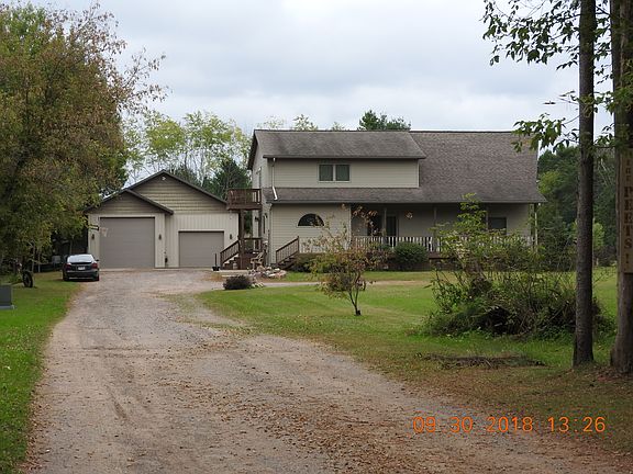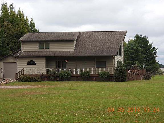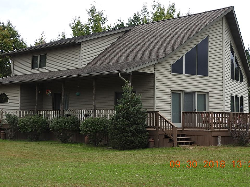 Great family or vacation home on 2.77 acres, located in a quiet friendly neighborhood. This home offers 5 bedrooms and 3 baths. Its has an open concept, vaulted ceiling,1st floor laundry, and stainless steel appliances. Also has oversized windows and a 9ft patio door in the great room which opens to a large deck. It has a covered deck out of the dinning room patio door and a balcony off the master bedroom. The master bedroom is the entire 2nd floor, with a walk in closet, on suite with a whirlpool tub, and a second room which we use for the tanning bed but could be used as a second walk in closet or a small office. The finished basement has in floor heat, family/rec room, 3 bedrooms all with egress windows, full bath, and has a separate entrance. Which I used for my salon. This works great if someone has a in home business or someone wanting a separate in-law suite, rental potential, a two family vacation home, or just wanting enough space for the family. It has seamless steel siding. New hot water heater. The finished 1500 sq. ft. insulated and heated garage has 3 overhead doors, 2 large enough for a camper. It has water, natural gas, and cable and is set up with in floor heat. The garage attic is finished for storage.