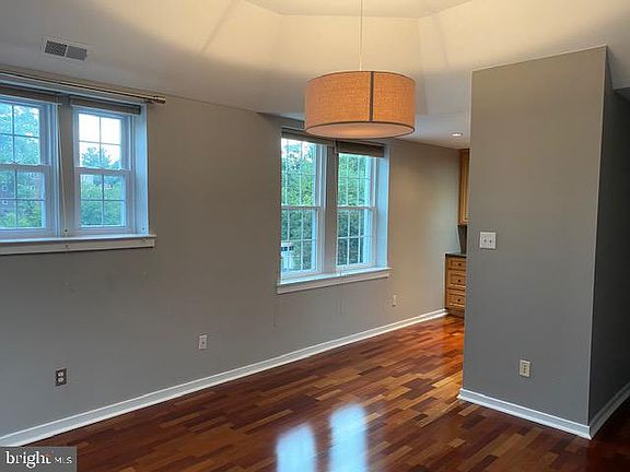 This spectacular corner, top floor, 2 bedroom 2 bath condo has high vaulted ceilings, a skylight and awesome Brazilian cherry flooring. It is the best location in the entire complex, in my opinion, with a Southern and Western exposure. It is away from Montgomery and Woodside traffic, The fully, well equipped kitchen with tall cabinets to the ceiling, stainless steel appliances and granite countertops was renovated with the best intentions and has hardly been used. The wood flooring extends from the corner wood burning fireplace, through to the living, dining areas, the kitchen, the hall to the bedrooms and into the 2nd bedroom. The master bedroom features high vaulted ceilings and a walk in closet with reconfigured shelving, hanging space and storage space. The master bath has a handsome wood vanity and updated lighting. The 2nd bedroom closet is fitted out. The hall bath has a wood vanity, big mirror and is well lit. The heating is gas, forced air, with central A/C, and the hot water heater is new. This is not approved for student housing. Balcony is shared with 5 other units on the floor. The condo is .4 of a mile to train, a short walk to Suburban Square, Farmer's Market, Trader Joe's, restaurants, work out place and coffee spots. No pets or smoking permitted, no exceptions. Owners would like a longer term tenant, i.e. to stay for longer than one year.