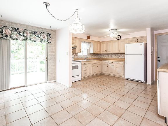 & linen closet. The updated eat-in kitchen has lots of cabinets, ceramic flooring & sliding doors to