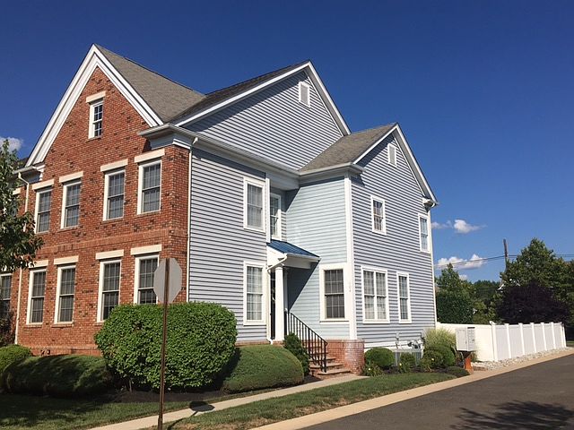 In the heart of Town Center Robbinsville, this elegant 2,400 SF Coach V duplex has been meticulously maintained and is decorated in soft neutral tones. Tucked away on a private street with steps to the parks, shops and lake in Town Center, this spacious 3 BR, 2.5 BA, includes a private first floor office and full size basement. Features a dramatic two-story foyer with neutral tile flooring in the living room, a vibrant family room with gas burning fireplace complete with wood floors & crown molding throughout the rest of the house. The master bedroom contains a large attached sitting room which can serve as a nursery or additional bedroom. Kitchen has been remodeled with granite countertops, GE appliances, plenty of cherry cabinets and shows a large center-island with separate breakfast area with bay window. The backyard is fenced in with a paver patio great for entertaining and surrounded by pristine landscaping for privacy which leads to a one car garage. Top rated Robbinsville schools.