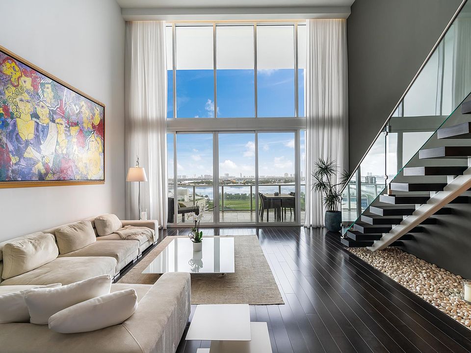 Step inside this distinctive two-story loft in the sky with spectacular bay + downtown views. This highly desirable East-facing corner residence features 2 beds, 2.5 baths, 20ft ceilings, double height glass, and natural sunlight throughout. Designed + remodeled by renowned Lineaire Designs, the contemporary, open space include a modern kitchen with stainless steel counters and cabinetry + Subzero and Bosch appliances. Appointed with wood floors, designer touches throughout and custom closets.The spacious master suite bordered by a custom glass enclosure with motorized blackout shades. A private terrace with forever views & a focal point floating staircase complete this space. With top amenities, luxury meets location at Ten Museum Park. Minutes to Wynwood, Sunset Harbour & South of Fifth.