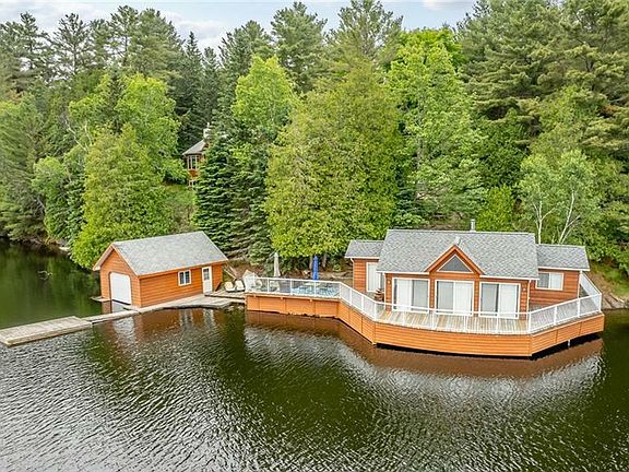 Executive waterfront retreat combining natural beauty with landscaped flagstone patios, walls and perennial gardens. Designed to delight family and friends. This property has everything you could want and more. You will start your tour entering the stone pillared iron gates. Located on over 400 feet of waterfront and 2.25 acres of property, privacy is the order of the day. Whether at the cottage, at the waterfront or while sunning at the patio with hot tub, you will be in your own private oasis. Designed with views of the lake from almost every room. This executive waterfront home or cottage includes such features as hardwood floors throughout, Birdseye maple trim, cathedral ceilings, fireplaces in the living room, sunroom, and master bedroom, winterized sunroom, and composite maintenance free decking. Guests will love the 700 sq. ft. waterfront guest cottage overlooking the lake, that includes 1 bedroom, combination living dining room and kitchen, plus a 3 piece bath. Also at the waterfront is the 24.5' x 18 ft wet slip boathouse for keeping all the water toys safe. When you do venture out on to the lake there is over 25km of lakes to explore on Haliburton's premier 5 lake chain. While you are at it stop at the waterfront patio at Bonnie View, or perhaps stop at the town dock in Haliburton? Back at the cottage there are several sitting areas to choose from, waterfront dock, flagstone patio with hot tub, more patio around the ground level of cottage, and then a large deck off the main floor. Imagine dining on the large deck, or perhaps it's cocktails on the patio, or is it sunsets on the dock? There is always a new spot to enjoy. For the land toys there is the oversized 28' 6 by 24'4 double garage. If there is something else you are looking for we can't imagine what it could be! Make your appointment to view this spectacular property before you miss out.