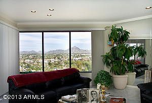 Classic North Central hi-rise with incredible amenities. Mountain views and city lite views from every room. Open floor plan. Views from master bedroom are to die for. Building has 24 hour doorman, security guard,party room with full kitchen,work out room,guest suites for rent,community pool and spa and under ground parking. Located right across from the phoenix country club and easy access to downtown