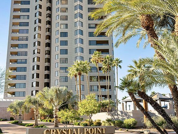 Rare opportunity at Crystal Point to own the most sought-after floor-plan and view. Imagine living above it all with unobstructed views of Phoenix Country Club, Camelback Mountain, The Superstitions, and South Mountain. Enjoy morning coffee with fabulous sunrises and evening cocktails with spectacular sunsets and city lights. Views can be enjoyed from your living room, den, master suite, second bedroom, and your glass-walled terrace. This residence includes 2 parking spaces in the secure underground parking garage, directly adjacent to the elevator. Also, included is a large, storage unit in the garage rare for high-rise living. Crystal Point offers a maximum of four units per floor, award-winning architecture, concierge service, and 24-hour reception/security. Olympic-size pool,