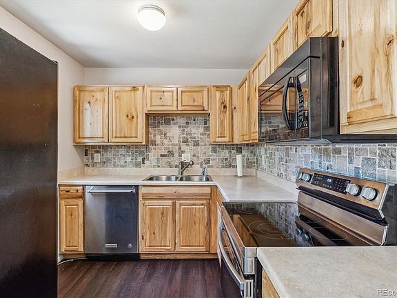 • Description: Hickory Cabinets, Neutral Appliances, Tiled Backsplash