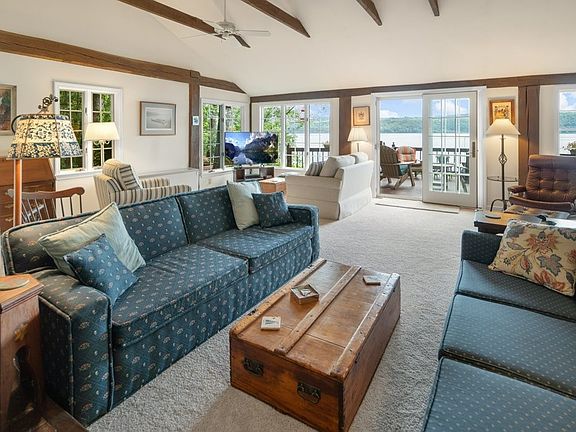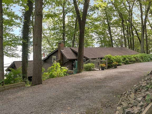 This year-round home offers peaceful living and is surrounded by nature and is situated above beautiful Cayuga Lake. This well-designed home has a spacious open floor plan with living room, a gas fireplace, dining room and kitchen - All opening to a huge front deck facing the water. Fully equipped kitchen with a work island. Cozy family room/den could be used as a fourth bedroom. Main floor half bath and laundry. Circular stairway connects to the three bedrooms and two full renovated bathrooms. There is an open study area suitable for a home office. The two car garage offers ample storage and a work bench area. Many outdoor spaces for entertaining on the main deck. Two private patios and an area ready to install a hot tub. Owners have taken meticulous care of this gem of a house. Just a short distance to the Yacht Club and docks for your summer enjoyment.