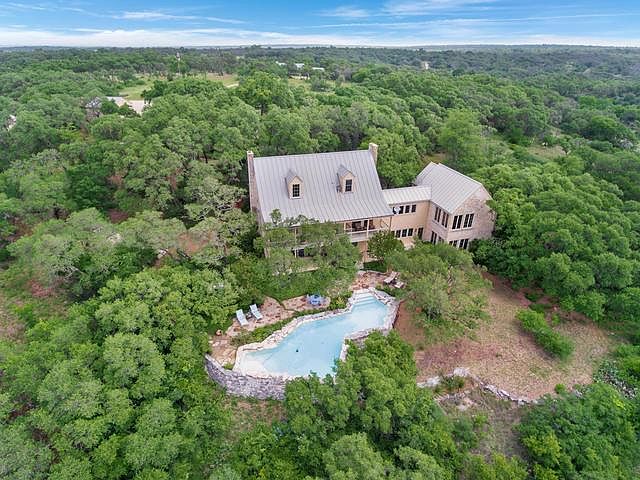 In the Heart of the Hill Country, this Masterpiece sits in the Hills of 42 acres with long range views! Sisterdale stone exterior and interior walls, hardwood floors, beamed/vaulted ceilings. Private bedroom on each level with 2 master suites with galley/study areas, private baths, one with a den & balcony. Gorgeous rock ledged River Oaks Pool. Guest house w/ screened porch, Separate sauna, greenhouse/studio. Decorative windmill. Charming Hill Country Luxury style on secluded treed acreage with Views!!