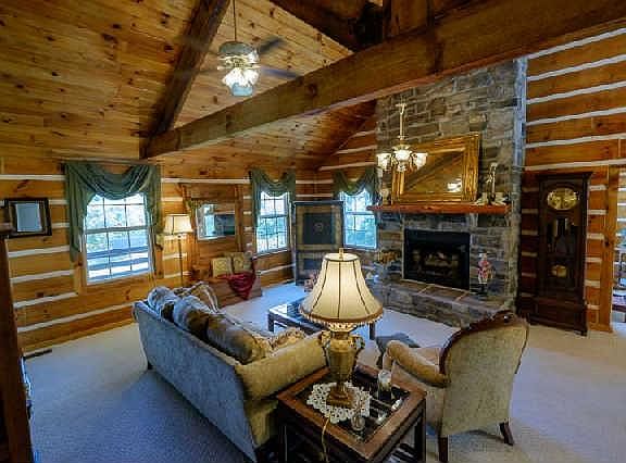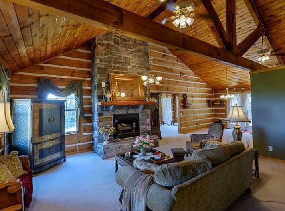 "This is the view everyone is looking for!" Custom built log home on 31 scenic acres. Covered front porch, stone fireplace, Ash cabinets & granite counters in kitchen, sunroom, fenced area for cattle or horses, privacy, storage building & equipment shed.
