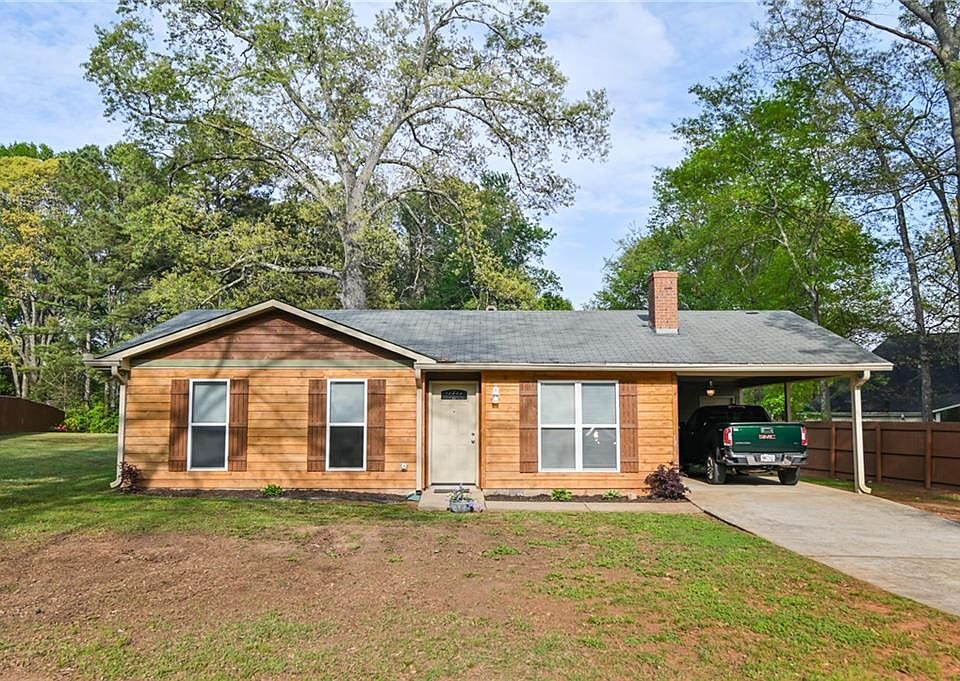 Renovated and move-in ready.....Today!! Well-built 3 bedroom/1 bath home on level, partially wooded .91+ acre lot with a spacious storage building. No subdivision. No HOA. This home has been updated, renovated, and is clean as a whistle. Ideal for downsizers or first-time home buyers. It has been all fixed up with new or nearly new: cedar siding on front, HVAC-2023, fresher paint, LVP flooring, pressure washed 2024, light fixtures, can lights in kitchen, double-paned, vinyl tilt-in windows, upgraded carpet and padding in bedrooms, soft-close cabinetry (love this) in kitchen and new vanity cabinet in bathroom, granite kitchen countertops, tiled shower/tub, stainless appliances: stove/oven, refrigerator, dishwasher and microwave, plumbing and fixtures, ceiling fan, electrical throughout. 20X20 matching outbuilding! Spacious kitchen with breakfast area/serving counter or desk, spacious family room with stone surround, mantle, vented through brick chimney for a wood-burning stove (stove not included). Covered carport with secure storage closet. Conveniently located to Covington, Conyers, I-20 and minutes to Covington Square. Seller offers buyer compensation at 3%. Offered "AS IS"