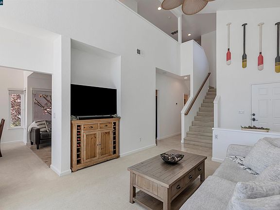 Light, bright, and with views overlooking the lake in Canyon Lakes. This gorgeous detached home has the feel of resort style living with vaulted ceilings in many areas. A wall of windows allows for lots of natural light with the open concept kitchen/dining room. With no direct rear neighbors, the home backs to HOA space. Stunning lake views from a large primary bedroom that has two large closets, one as a walk-in. The updated primary bathroom has a dual stand alone vanity with a quartz countertop and Moen faucets. The enlarged shower has a bench with multiple Hansgrohe shower heads and body shower. The kitchen features granite countertops, newer LED lighting, and views over the sink and to the backyard patio. The home features low maintenance yards, newer dual pane windows and slider doors, a tile roof, large ceiling fan in the living room, and gas burning fireplace in the family room. The development has 24 hour security, 4 pools & spas, tennis/basketball, clubhouse, walking trails. It is conveniently located near the San Ramon City Center, award winning SRVSD schools, shopping, restaurants, gym, parks, freeway access and so much more!