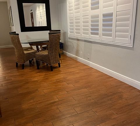 Driveway provides ample parkingPrivate fenced yardWood-colored tile flooringAmple cabinet spaceUpdated kitchenStainless steel appliances
