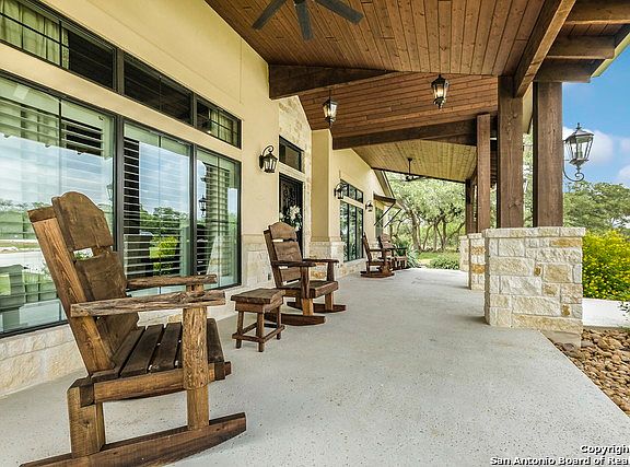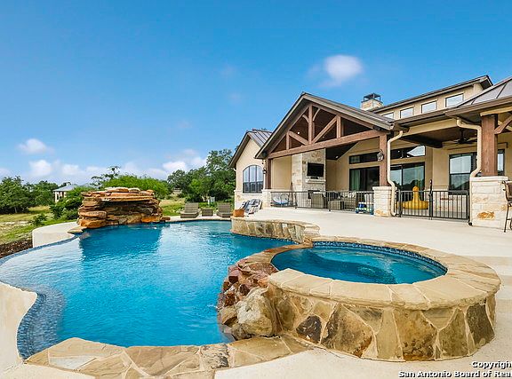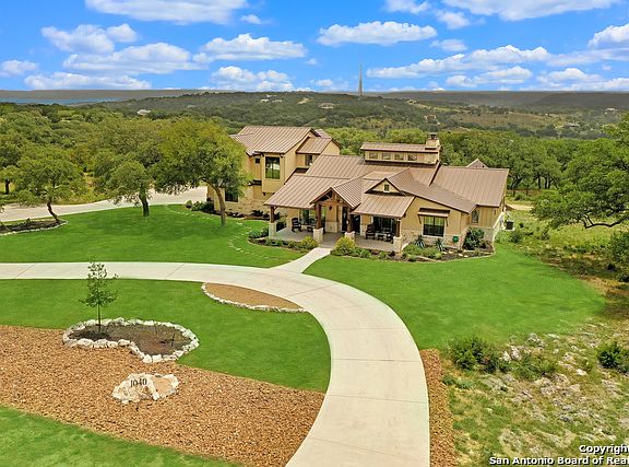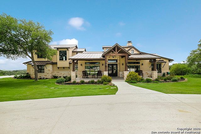 Seclude yourself amidst the wildlife on 5 acres of enviable hill country acreage. Enjoy evenings on the back patio warmed by your choice of a fire pit or wood burning fireplace. Entertain with fluidity as French sliding doors join the patio to the main level living area and kitchen, accentuated by vaulted ceilings with skylights and exposed wood beams and granite counter tops. Built to entertain, this home features a media room that has access to the outdoor covered patio area. Upstairs is two bedrooms, each with attached full bathrooms and walk- in closets, and a family room with one of two wet bars, and French sliding doors opening up to a covered balcony with stair access to the lower main level patio. The main level renders the owner's suite with attached en suite glamorized by a garden tub and walk-shower. In the evenings you will find yourself situated out on your front covered porch watching as the sun sets in the west, as the variety of deer roam the lands, they call home.