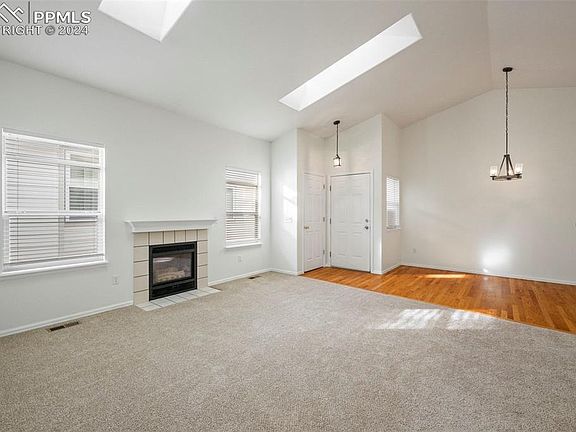 Welcome to this charming 3-bedroom, 2-bath ranch-style condo in the highly desirable gated community of Foothills at Cheyenne Autumn. Backing to open space, this home features a large wood deck perfect for relaxing or entertaining. The home boasts neutral colors, vaulted ceilings, skylights in the living room, and a gas fireplace with a tile surround. The kitchen includes all appliances and a spacious pantry. The laundry area, with a washer and dryer, is conveniently located off the oversized 2-car garage with ample storage. The primary bedroom retreat offers beautiful views, an attached full bath with double sinks, spacious shower, and a large walk-in closet with access to crawlspace storage The second bedroom, ideal as an office, has a walk-out to the deck, while the third bedroom provides additional versatility. A second full bath, located off the living room, conveniently serves guests and the secondary bedrooms. the home also includes A/C, a new roof 4/24, and newer Furnace 4/22. Enjoy proximity to Cheyenne Mountain State Park, the Broadmoor Hotel, World Arena, Ft. Carson, and downtown Colorado Springs. This is an exceptional opportunity in a prime location!