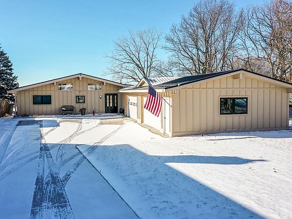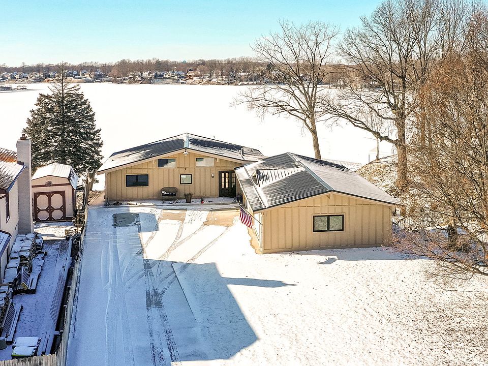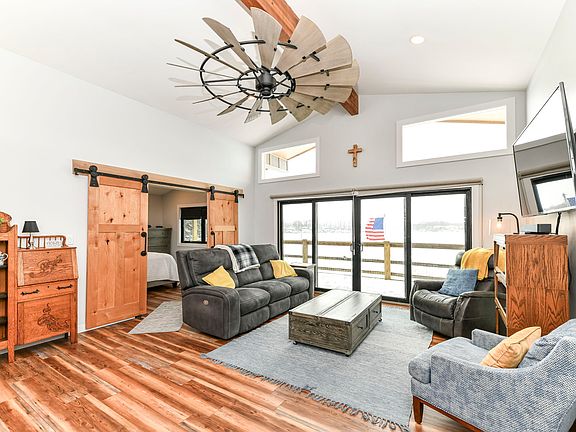 Are you ready for lake living? This is your opportunity! With a premiere location on the lake, this beautiful home has been completely renovated from top to bottom and inside out. The newly created, open concept floorplan provides breathtaking sunset views from every room on both levels! No need to list the updates because EVERYTHING is new! This home was taken down to the studs and features all new electrical, plumbing, drywall, flooring, kitchen and baths. New, black, Anderson Windows and Doors were installed throughout, along with a new black metal roof. No interior or exterior maintenance needed for a long time! The upper level features a newly remodeled open concept living plan with an enlarged, modern kitchen with premium finishes and appliances, a living room with a vaulted celiing and two bedrooms and two full bathrooms (primary bed/bath included). The walk-out, lower level is another wide open entertaining space for friends and family to enjoy. This will be everyone's favorite living space! The custom bar opens to a huge family room that has space for dining and lounging and leads right out to the lake through a set of brand new Anderson Window glass doors. The bedroom on the lower level faces the lake as well and there is another brand new full, custom bath. Outdoors, 80 tons of soil was added to create access to the lake on both sides of the home. Landscape walls were stabilized and two new sets of concrete steps were added in order to access lake from both levels. A U-shaped dock provides a space for whatever boat you choose and there is a wood boardwalk along the shoreline. The garage is like no other and boasts 1,110 + SF of storage area. Unheard of and necessary for your new lake lifestyle. The driveway was expanded and all new concrete and drainage was poured for both the drive and the garage. The only thing left to do is choose a paint color! With little to no inventory on the lake, hurry to make your offer!