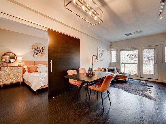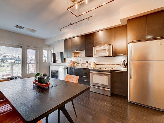 This 2 bedroom plus den apartment on the top floor is in fantasic condition and shows like new. The layout is open and has a great outdoor space . The home has lovely finishings with Corian counters throughout the kitchen and both bathrooms. The main bedroom has access to the 4 pc ensuite, and the 2nd bedroom with modern style barn door access. There is a second bathroom as well as a den to usa as office or extra storage and includes the stackable washer and dryer. Forced air heating and cooling as well as hot water is included in the HOA fees. The building is secure with an underground parking spot and a storage locker included. Pets and rentals are allowed in this Building.