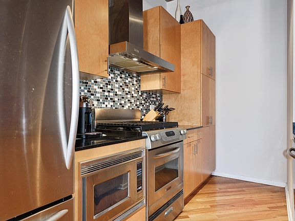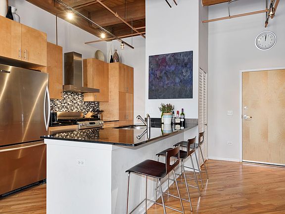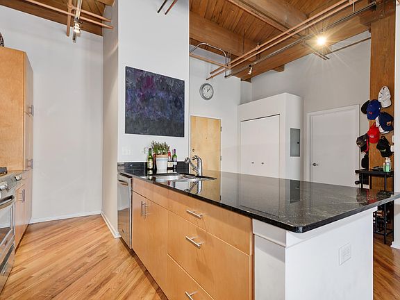Sophisticated loft, w/ exposed brick & huge windows. Angled HW floor will greet you at the door & sweep you into the bright living area! Enjoy the granite island, ss appliances, maple cabinets & 12 ft. timber ceilings . Master w/ organized walk-in closet. W/D. One garage parking spot included in price! 24hr doorman, movie , exercise, business center & more! Available August 1- No pets!