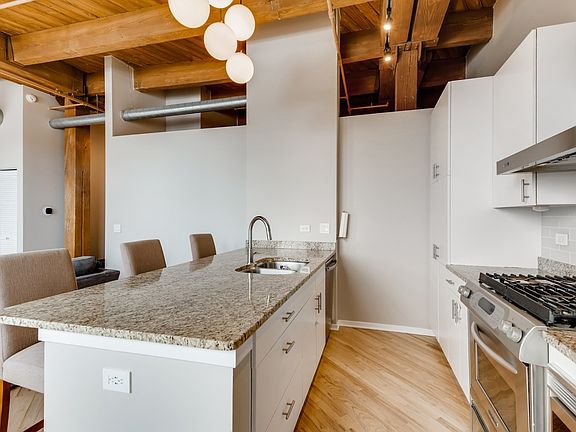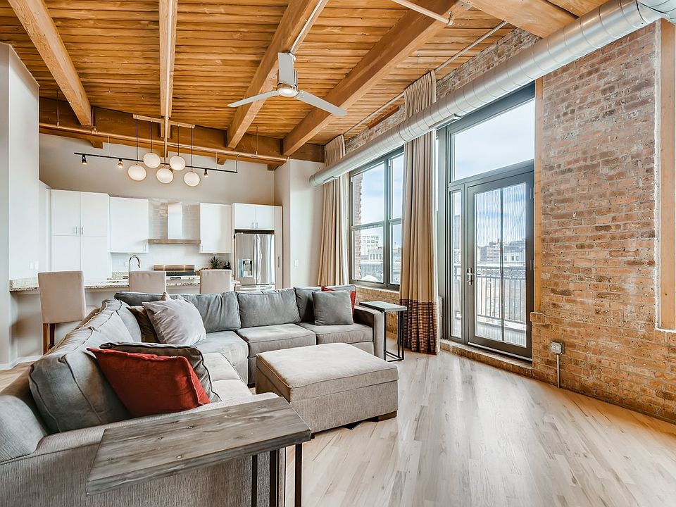 Loft home in the West Loop. Top floor condo with 12' ceilings, large balcony, and 1 parking space in heated garage. Building amenities include movie room, gym, peloton/yoga room, business center, conference room, dry cleaning, storage locker, bike storage, guest parking, outdoor dog run, and owner's club with pool table and outdoor area for grilling.