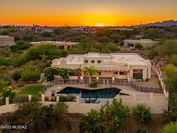 Gorgeous ridgetop custom home in prestigious gated Canada Hills Estates with terrific views of Pusch Ridge and the Santa Catalina Mountains. Spacious 4 bedroom, 3 bath Santa Fe style home with separate living room, family room, and formal dining room, plus high ceilings, tiled floors and 2 fireplaces. Large rear yard has lots of room for entertaining, great views, professional landscaping, multiple patios, a negative edge pool, and a large spa. Recently professionally updated with fresh interior and exterior paint, all new stainless steel appliances, new granite counters, refinished cabinets, new sinks, & a large new tub. Custom built by Michael Almli with high ceilings, dramatic entry, oversized 3 car garage, and great window spaces to take advantage of the view. Private front courtyard. Numerous mature fruit trees in back. Long driveway and large parking area with custom block pavers. Excellent schools, shopping, and parks nearby. Situated on a high lot at the end of a cul-de-sac. Single story home, but with 2 steps down to the bedrooms on the south end of the house. Roof just refurbished and recoated and under warranty. Several large picture windows just replaced. Two HVAC units, two water heaters, and a central vacuum system.