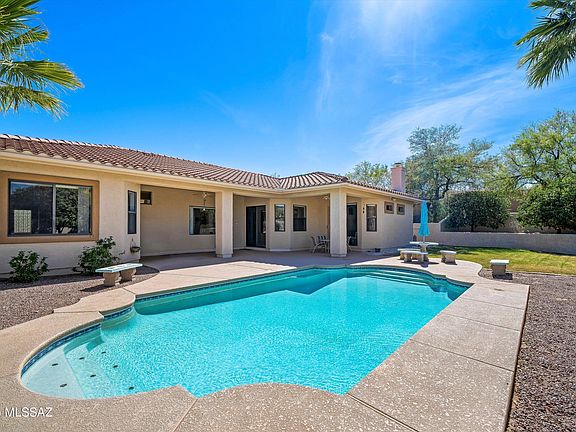 Located in a coveted Canada Hills Est .a gated golf community in desirable Oro Valley close to trendy restaurants & breweries. Nestled on a premium corner cul-de-sac lot. Rare opportunity to own a hm. this price in the Estates! Courtyard entry is the perfect spot to enjoy Mtn. views. Flexible plan w/multi-function living options. Centrally located kitchen w/granite counters, dbl. oven, & Lrg. Island joining gr8 Rm. opening to lush rear yard w/sparkling pool, fruit trees, grass & Mtn. Views. Further enhance rear mtn. views by selectively trimming trees & creating adtl. seating area. Expansive primary suite, dual closets, Jacuzzi tub, & walk-in shower. Extended depth 3 -car Evap cooled garage w/storage. Roof 6months old, HVAC & H20 heater replaced, soft H20 .