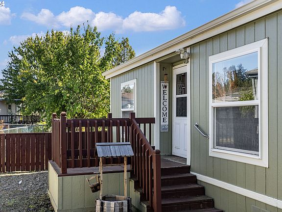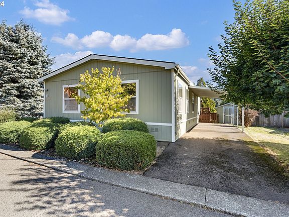 Nestled in the attractive and highly sought after Giadanj Lake Estates is this three bedroom, two bathroom home. From your first step inside you will notice the open concept floor plan enhanced by an abundance of natural light and complete with new heat pump. Other amenities include walk-in shower, soaker tub, skylight, all kitchen appliances, and a newer stacking washer and dryer. This park is well-maintained with managers living on site. Step out back and relax on the large deck overlooking the beautiful lake, enjoying its variety of waterfowl with its resident bald eagles. Hummingbirds dot this fully landscaped fenced yard with sprinkler system for easy maintenance. The house was painted, had a new roof with gutters installed and a brand new floor in the shed in 2021. Great location in the heart of shopping, restaurants, and on easy bus route. Take a minute to check out this move in ready home in this pet friendly, family friendly park!