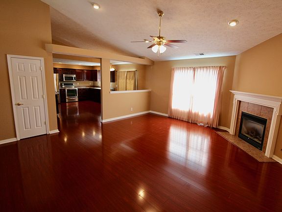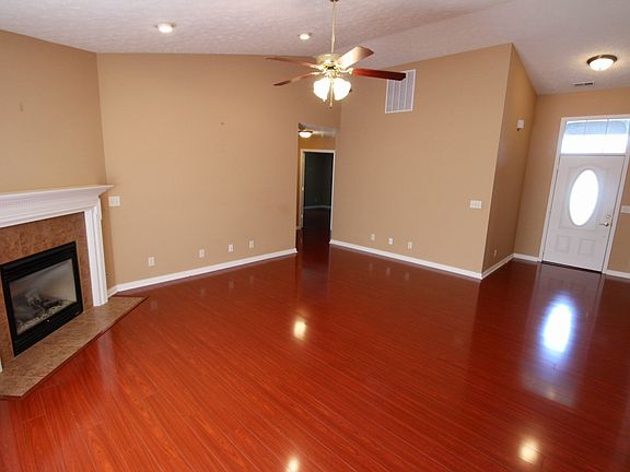 Fantastic home located in McCutchanville in Stonecreek! Open floor plan with tall vaulted ceilings in the living room and gas log fireplace. Entire main floor has beautiful Armstrong laminate flooring and vinyl floors in bathrooms. Kitchen has lots of cabinetry and upgraded KitchenAid & LG Appliances. KitchenAid Stainless appliances were installed in 2015 and LG French door refrigerator in 2018. Owner's Suite has spacious bedroom and bathroom complete with step-in shower, jetted tub, wide vanity, toilet room & walk-in closet with high & low racks. 2nd & 3rd Bedrooms are both large and have wide closets. Laundry room is located off kitchen has included washer & dryer and pantry area. Garage has included shelving and a side service door. High-Efficiency Gas Furnace & A/C and Electric Water Heater. Outback features a nice wide patio and yard with trees behind. Please No Shoes when Showing.