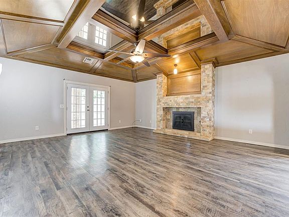 Welcome to this beautifully maintained 3-bedroom, 2.5 bathroom home nestled on a peaceful cul-de-sac in a desirable neighborhood. From the moment you arrive, the home’s charming curb appeal and well-manicured lawn invite you in. Step inside to discover a spacious living area featuring stunning wood-accented coffered ceilings, a cozy stone fireplace, and luxury vinyl plank flooring throughout. Natural light pours in through the french doors, creating an inviting atmosphere perfect for entertaining. The kitchen features rich wood cabinetry, stone backsplash, gorgeous countertops, and a breakfast bar that opens to the dining space. With updated appliances and ample storage, it’s as functional as it is beautiful. The primary bedroom is generously sized with an ensuite bathroom that has dual sinks, dual closets, and a ton of storage! Other features include an inground storm shelter and storage shed in the backyard! Whether you're a first-time buyer, downsizing, or looking for your next investment, this home offers style, comfort, and value. Conveniently located near shopping, dining, schools, and parks! Schedule your private showing today!