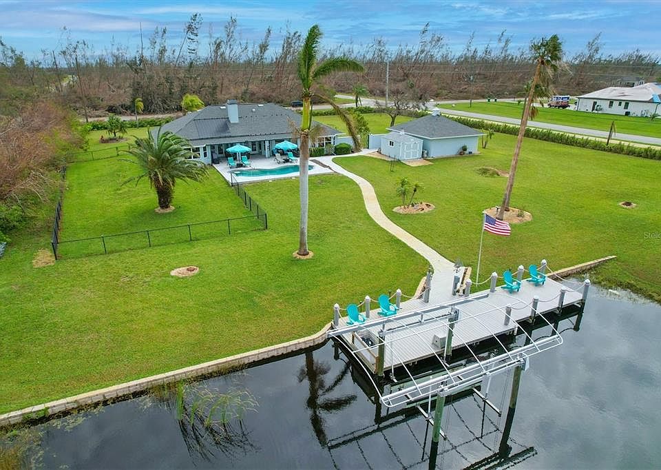 Welcome to this rare 2 acre waterfront paradise in South Gulf Cove! In addition to a luxuriously modern 3 bedroom pool home, this property owns 244 feet of waterfront that wraps around the canal and has two additional attached garages/workshops. The only thing better than the amazing sunset views down the long canal from the pool lanai is sitting right on the decorated 45' dock watching the fish jump, the lily pads bloom, and the glow of the under dock fish light. The dock has electric, water, and a 9,000 lb boat lift for easy boating out to the lagoon (1 bridge) and protective lock system. From there you have access to fresh water rivers, the estuary of the wide open Sound, and the salty tides of the Gulf of Mexico. A new addition to the waterfront is a brand new 30' x 50' x 12' high garage that can fit up to 8 cars/toys. There is a back driveway from it down to the canal for easy access water craft storage. Looking back at the main house you will see that in addition to a 2-car garage in the house there is an additional 2-car detached workshop, both with A/C and insulation. There is also a new 14' x 10' Tuff Shed on a concrete pad. Sitting on this pavered pool patio, you are surrounded by 2 acres of landscaped fruit trees, palm trees, woods and water. Perfect Florida paradise. And we haven't even gone inside yet! The long driveway and screened front porch welcome you to a modern updated interior, complete with plank-style luxury vinyl flooring throughout, luxury lighting, new ceiling fans, and granite countertops everywhere. High ceilings, arches and columns, plantation shutters, window seats and bay windows add elegance to every room. The huge kitchen has brand new appliances, a built in desk area, and a walk in pantry. Eat in the formal dining room overlooking the front gardens, or the dining nook overlooking the water, or the long wrap around breakfast bar. The den hosts the 8-camera security system monitor, complete with phone app, for piece of mind. The owner's wing has a large bedroom with a sitting area, a divided/shelved walk-in closet and a large bath with separate sinks and walk-in shower and its own A/C unit. The other 2 bedrooms and bath are on the other side of the house behind a pocket door for privacy with their own entrance to/from the pool area. While this home was originally built in 1994, the 2429 sq ft main house has been fully modernized in the last 4 years with too many updates to list them all. Check out the full list of updates and upgrades in the attached Special Features list. The real testament to its maintenance and care is that it survived Hurricane Ian's 155 mph winds with only minor damage (all repaired) and no water intrusion from the canal or the rains. Enjoy the peace of mind a truly tested structure will give you. Where else can you find such a beautifully modern home with additional storage and workshop buildings on such a beautiful expansive waterfront property? Come check out your new home in Paradise!