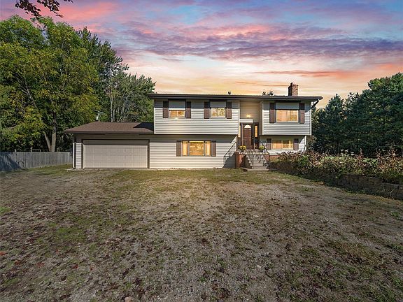 The main level features a welcoming Living room that flows to the eat-in kitchen with a dining nook and Sliding glass doors to the enclosed balcony with plenty of natural light. The Kitchen offers generous counter space and cabinetry, providing storage for food, tools, and other kitchen items. Down the hall, three bedrooms with overhead lighting and a full bath with a new stand-up shower. Lower level is a host's dream and has tons of character with a warm gas fireplace. The wooden bar and pool table (included) will be perfect when entertaining guests. Washer and dryer are available in the utility room, conveniently tucked way from the main area. Outside, the raised balcony has stairs to the sizeable deck below, great for BBQing in the summer or lounging after a long day. Backyard is fenced in, with an insulated pole barn (wood burner available not installed). The Attached two-car garage has direct access into the home and also a back entrance via the backyard. Garage is insulated and has a gas heater. When in season, morel mushrooms and organic blueberries will grow on the property! This home is perfect for those who want their own slice of land without the hassle of maintaining several acres. This home is great for those who enjoy the serenity and privacy of rural living. Some updates include: roof (2019), windows and furnace (2024), deck (2025) and stand up shower (2025), New carpet (2025), Freshly painted (2025), Appliances included. Schedule your private tour today!