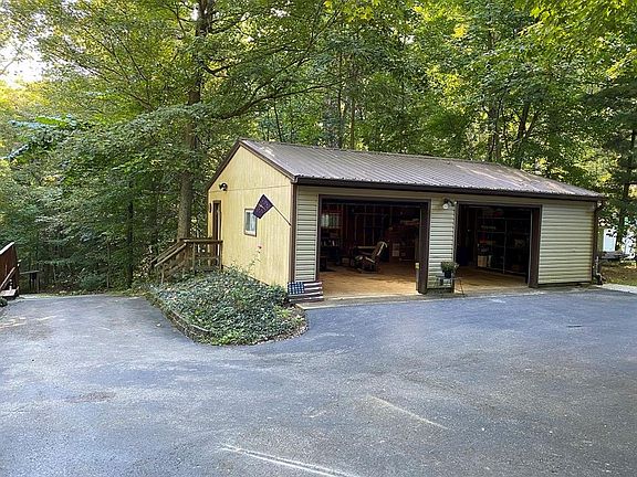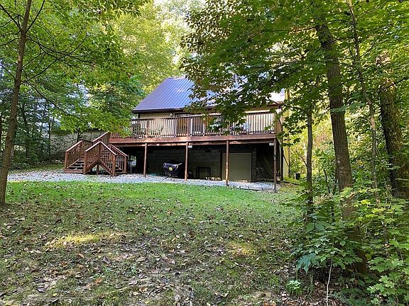 THE SPECTACULAR VIEWS FROM THE LARGE WINDOWS AND DECK WILL MAKE YOU WANT TO CALL THIS HOME! 2-story 3BR 1 1/2BA 1792+/-SF on almost a wooded acre with 2C-detached garage. The open concept of this home with the wood beams to look down over the staircase from upstairs will take your breath away. Kitchen cabinetry includes a desk/work area, dining room is open with the living room. The main bath shares the utility area with bedroom on main level. Upstairs 2 large bedrooms with 1/2 bath. Blacktop driveway. Firepit area for enjoying cook outs. Amazing backyard surrounded by trees to enjoy the wildlife. Access to Cataract Lake and dock for your boat. HOA includes clubhouse, pool, road maintenance & trash. Internet is high speed fiber.