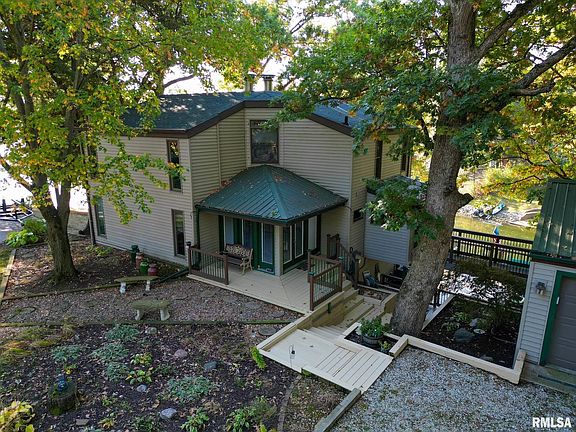 Lake Camelot Lakefront 2story home with 3beds 2.5baths! If you are looking to live on the water, this updated house may check off all of your boxes! Gorgeous views, multiple entertaining spaces and excellent fishing cove on 110 ft of lake frontage on the upper lake. Fish, boat and kayak off your private dock! Step inside to find a unique layout with updated flooring and carpet, beautiful white kitchen with gorgeous solid surface countertops, living room and dining room with lots of windows showing off the spectacular lake views, main level laundry and half bath. Upstairs you have the primary bedroom and bedroom #2 currently used as an office and shared full bath. Navigate to the basement to find entertaining family room, bedroom #3, office space or additional bedroom, full bath and access to the deck and lake. Retaining wall and dock area just replaced. Roof 2023 including gutter guards, water heater 2024. Lake Camelot has 2 lakes for fishing, boating, gorgeous pool, tennis/pickleball courts, playground and year around activities! Come and see what lake life is all about in this great community!