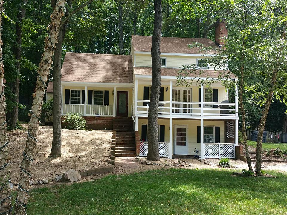 Beautiful home in quiet leafy location with mature trees. Available for immediate occupancy, please call Peter at to schedule an appointment. 4 or 5 large bedrooms and 3 full renovated bathrooms. Approx. 2,350 square feet in friendly, walkable Crown Grant neighborhood, off Pump Road at Short Pump. Five minute bike ride to Deep Run Park. Five minutes to Short Pump Shopping Mall. Great schools: Gayton Elementary, Pocahontas Middle and Godwin High School. Open eat-in kitchen with stainless appliances and granite counter tops. Family room has French doors to covered front porch. Sun room includes additional eat-in breakfast area. Upstairs and downstairs master bedrooms. Huge (18 ft. x 7) walk in closet. Finished lower level room can be additional 5th bedroom/office/children's play room or entertainment room. Additional attached storage shed outside. Covered front porches. Fenced in back yard. Great for families. Near Crown Grant covered bridge. Includes all appliances: stove, microwave oven, refrigerator, dish washer and disposal. Central air conditioning and heat pump. Newer hardwood floors on main level and newer carpet on upper and lower levels. Credit check and one month security deposit. Pet fee $300.00 per pet.