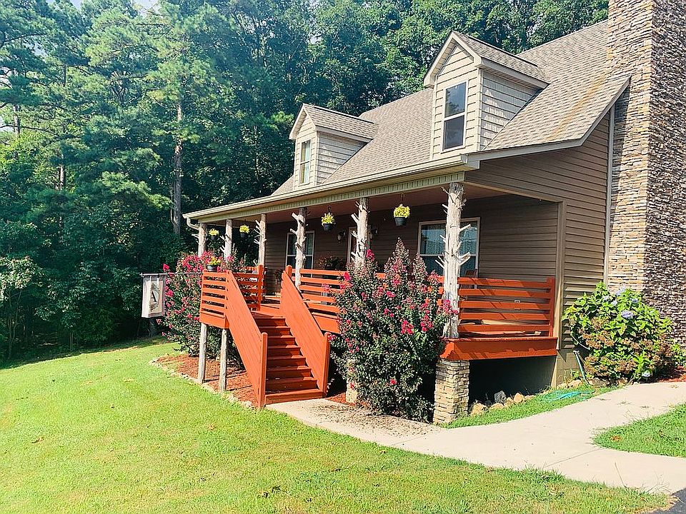Less than 5 minutes from Lake Guntersville. House will be sold fully furnished! 4 wheel drive lawn mower will also be included. 1 1/2 story home on 6.2acres. Custom built in 2014. Cathedral ceiling. Interior features include white pine tongue & groove walls, poplar beams & accents, stone fireplace with wood insert, black walnut mantle, hickory hardwood in living & dining areas, white oak stair treads and rails, wrought iron spindles, and white pine baseboards, trim and crown molding. There is vinyl flooring in wet areas, carpet in bedrooms & loft area. Maple & birch cabinets. Bronze light fixtures & door hardware throughout. 12' x 40' covered, screened in back porch. . 8x40 covered porch!
