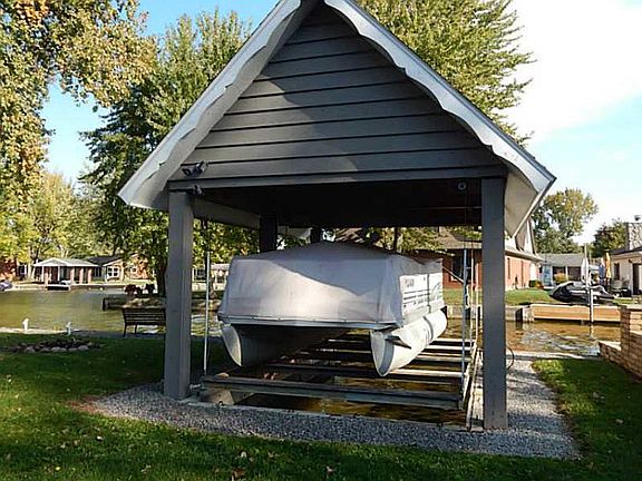 Darling "gingerbread" house situated on the water on Tecumseh Island. Includes detached 2 car garage, detached 1 car garage, and also a shed. Outside features also include a deck near the water's edge and a nice, single covered dock. Enjoy views of open water near channel's end. Inside features three bedrooms (one down; two up), large living area with gas fireplace, kitchen area w/bar, and more! Owner would consider selling furnished. Pontoon boat and golf cart are negotiable.