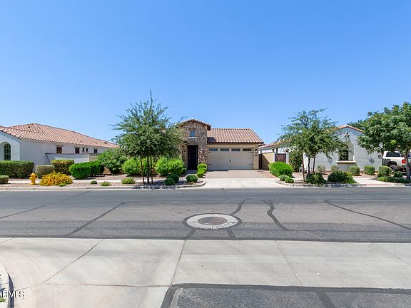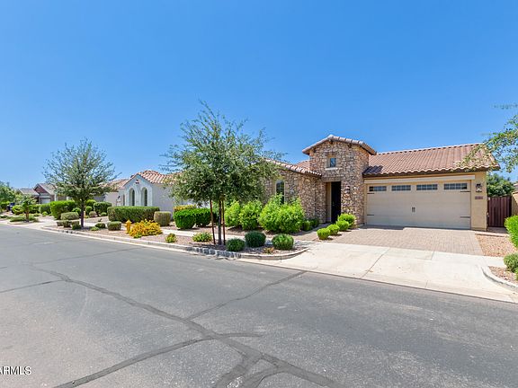 Discover this beautifully maintained home in the top-rated Eastmark community, featuring a spacious great room with vaulted ceilings and luxury vinyl plank flooring. The kitchen offers granite countertops, a gas cooktop, and a large island with a breakfast bar. Enjoy a master bath with a super shower and double sinks. The backyard boasts synthetic grass, pavers, and a fountain. A versatile flex room and a large, large laundry room add convenience. Situated directly across from a park, this home is a must-see!