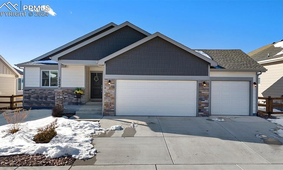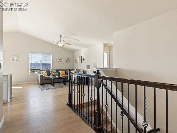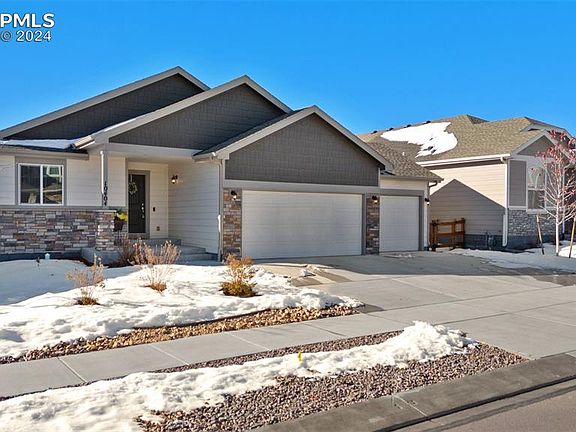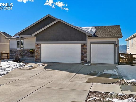 Stunning Views and better than new! This home is move in-ready with 4 beds, 3 baths and 3 car garage. Open concept main level living, dining and kitchen. Soaring vaulted ceilings, beautiful laminate flooring throughout, quartz countertops, SS and gas range in the kitchen. Dining space walks out to a huge covered deck and AMAZING Pikes Peak and Front Range views. Main level primary suite with 4 piece bath and walk in closet. The main level also features a guest bedroom and full bath and a laundry/mud room just off the garage. The finished basement boasts a large family room with endless possibilities. There are even Pikes Peak views from the basement! Two additional bedrooms both boast walk-in closets and a shared full bath round out the basement. Don't miss the large unfinished storage space in the basement that could be finished if needed. Enjoy year round unobstructed mountain views from the fully covered deck, easy to maintain landscaping in the front and back yards. This home is located close to schools, parks, shopping and entertainment with easy access to Powers Blvd. This home is a MUST see!