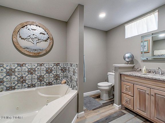 As you enter the home, you are greeted with a large open living room complete with lots of trim, vaulted ceilings, and a stone fireplace. Have a formal dinner with the family in the dining room, or sit down for morning coffee in the quaint breakfast area as natural light streams in through the bay window. Down the hall you will find all three bedrooms including the primary with two closets and a vaulted ceiling as well as both a full bathroom and the primary bathrooms. Head down to the basement where you can retreat to a large recreation room with a wainscoting, a drop ceiling, and a massive closet, or visit the newly constructed bathroom that boasts a brand new Jacuzzi tub with trendy tile surround, brand new vanity with a fog free mirror, and luxury vinyl flooring. There is a two car attached garage and a deck that is landscaped for privacy. Mature trees provide areas of shade in the backyard and this home backs up to an area of the old golf course that the neighbors work together to keep looking top notch.