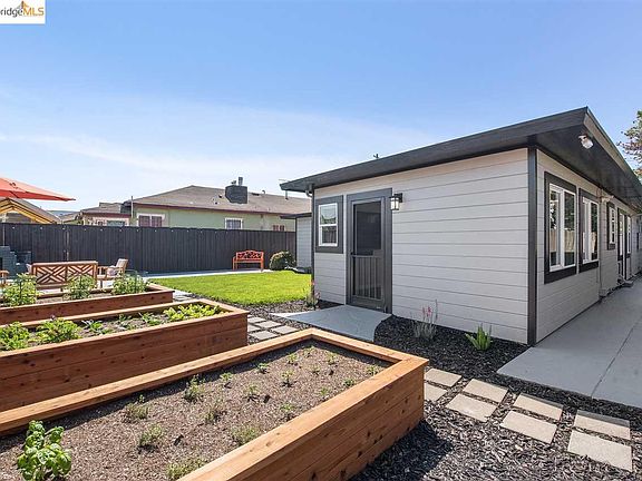 Wow! This sexy mid-century urban gardener's dream home will absolutely mesmerize you w/ its stunning looks, light filled rooms, indoor/outdoor flow, big open kitchen-family room combo, large lot & its modern minimalist appeal. You are immediately welcomed by an inviting front porch & an orange door instantly beckons you to enter this appealing abode. Exposed beams & wooden slatted ceiling offer a charm not often found at this price point. The living - dining room is graced by windows that practically run from floor to ceiling allowing for an abundance of light while complementing the mid-century vibe. The modern open kitchen faces the family room w/ an eat-in counter area and offers visibility to the wonderful backyard where you can grow ingredients for your summer dinners. The kitchen is graced with modern cabinetry, stainless appliances & offers a view of the TV while cooking. 3 raised beds afford you the opportunity to grow your own vegies. Close to San Leandro Bart, shops & dining