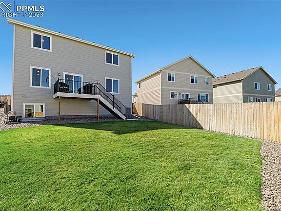 Immaculate LIKE NEW 2 story home on a quiet side street in Lorson Ranch! Fantastic mountain views from the back of the home and deck * Striking curb appeal - this is one of the prettiest elevations! Enter the home into a wide foyer that leads into the Great Room * Welcoming, eat-in kitchen with granite slab counters, pantry, stainless appliances and big center island with counter seating * Warm, inviting neutral tones throughout (no more cold gray colors!) and delightful upgrades everywhere you look * Primary suite with attached bathroom that has an oversized shower, double sinks and walk-in closet * Central A/C * Washer and dryer included! * Large garden level basement with natural light and plumbing rough-in in case you want to finish the space one day * For now you have great bonus space & storage! * Large composite deck off the main level, with room to grill out and dine outside * Lush green lawn, sprinkler system and fully fenced backyard * Don't overlook how easy winters are with the desirable South-facing driveway * This premium lot is across from open space!
