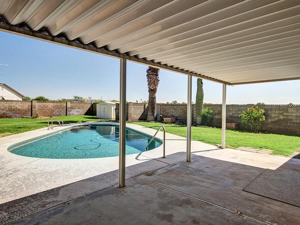 Wonderfully maintained 2 bedroom, 2 bath, 1 car garage Gemini home in highly sought after Sun Air Estates I. Abundance of living area with the spacious living room plus 3-season AZ room with double sliders. RARE exclusive private pool with premium over sized fenced LOT. Flooring is tiled with bathrooms recently remodeled, ceiling fans in all rooms, Grassy front and back yards are maintained by the HOA = LOW, LOW maintenance. The garage has attached cabinets for plenty of storage. This property is in a prime location! Wonderful 55+ living near major retail, hospitals, casinos, sporting events, restaurants & more.