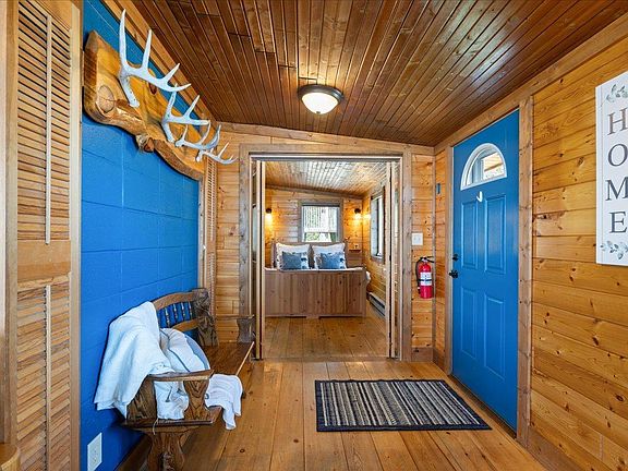 Welcome to your private lakeside retreat! This 1-bed, 1-bath home with two additional bunk houses can sleep 9 plus. Nestled on 17.2 acres of pristine land, just 25 feet from the water, boasting an impressive 308 feet of lakeshore on Big Sturgeon and the Side Lake chain. Enjoy stainless steel appliances, a washer & dryer, pocket bunk beds, trundle bed, and a gas fireplace. The property features a private, flat lot, complete with a treehouse for outdoor enjoyment. Relax on the sandy beach or in the inviting hot tub after a fun day of lake activities. Outside, find a dock, paddle gear, and screen house. Hunting enthusiasts, there are two enclosed deer stands on the property waiting for hunting season. There is a site prepped and permitted for an additional building. Conveniently located near amenities and trails, this haven offers year-round recreational opportunities. Schedule a tour of this move-in-ready property. Everything stays! Welcome Home!!!