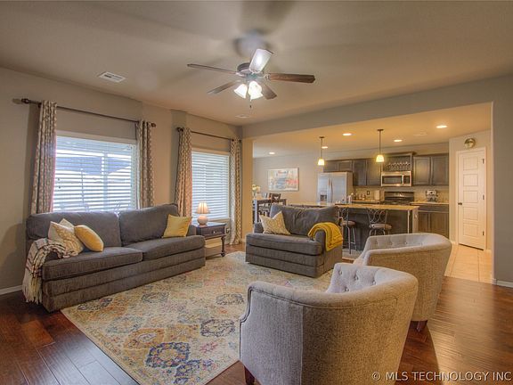 Immaculate 4 bedroom home in Jenks move in ready, on corner lot. Open layout, split bedroom floor plan with designer touches throughout Gorgeous Kitchen with granite counters and stainless steel appliances. Beautiful flooring. Large back yard with extended patio Neighborhood amenities include pool, park, dog park, soccer fields, basket ball courts, walking trails. Close to Jenks, Riverwalk, Tulsa Hills, Hwy 75, and Creek Turnpike