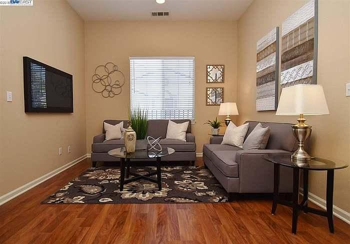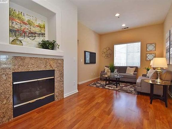 This lovely corner unit townhome style condo offers over 1100 feet of living space. High ceilings and lots of windows add to the spaciousness. The kitchen features maple cabinets, granite counters and a gas range. The living room has a gas fireplace, and newer laminate flooring. The dining area is very spacious has laminate floors and has views of your large private balcony. The master bedroom can handle the largest of bedroom sets, and offers a walk-in closet. The master bath has a very large vanity with dual sinks. The second bedroom is quite large, and also has vaulted ceilings. The guest bath has a shower over the tub. This home has central A/C and heat. All appliances upgraded in 2020. The home has a 1 car attached garage, plus a convenient reserved parking spot right next to the garage. The home is part of the beautiful Andalusia Complex. This gated community is very well maintained and offers a community swimming pool and a clubhouse which will be available to the tenants for use. If this wasn't enough enjoy convenient commute via Fremont BART and relaxing picnics on weekends in the Fremont Central Park. Schedule a tour today! MUST HAVE: Fico score of 700 or higher Minimum monthly income of $9000 Excellent rental history Credit and background check for each adult over 18 Zillow application required per adult Renters insurance required before move in. Renter responsible for gas and electric. Water and trash included in rent. Last month's rent due at signing. Strictly no smoking. No pets.
