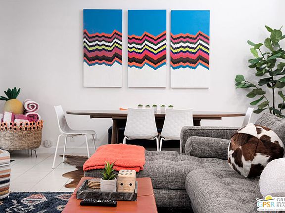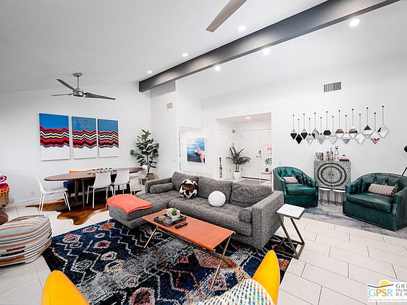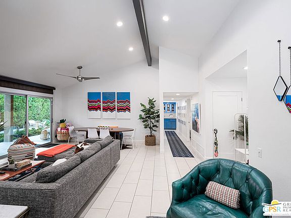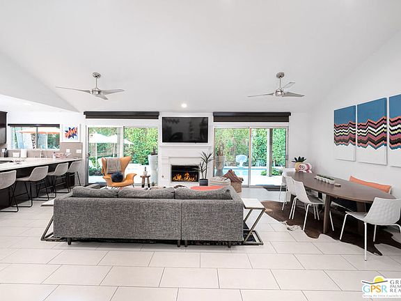 Turn-key Furnished Renovated home designed by architect Hugh Kaptur in Desert Dorado This stunning remodeled & upgraded three bedroom and two bathroom home has ALL that one wants in a homeboth indoors and outside The tall ceilings and open floor plan focus the home towards the outdoor space. The kitchen includes a large bar counter peninsula perfect for casual morning coffee and spacious for cooking prep, serving and bartending. The stainless steel appliances include a gas stove and oven, dishwasher & refrigerator with water dispenser. The adjacent laundry room and office nook provide functional convenience while "working from Palm Springs". The master bedroom includes ensuite bath with dual sink vanity, tub and shower, a spacious walk-in closet, seating area and overlooks the pool. Two guest bedrooms have individual outdoor access to personal patios. All bedroom closets contain built-in closet shelving and organizers. Sitting under wire-free mountain views, the elongated pool is ideal for swimming laps, playing pool volleyball or just floating under the sun. The expansive wrap-around yard includes multiple outdoor areas with dining area, tanning chaises, fire pit area with bench seating, open side yard with fruit trees, private bedroom patios, BBQ area and hedge-enclosed pergola with private lounging & outdoor game room. Lush mature landscaping in front and rear provide the perfect private entertaining space. Offered turn-key furnished. Sunpower Solar System 12.6kW across 35 panels. Outdoor shower. 2-car garage. This house is ready to enjoy now