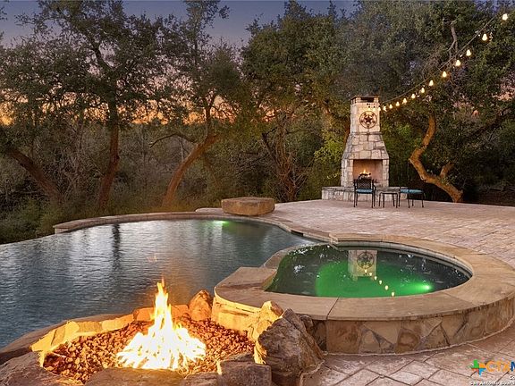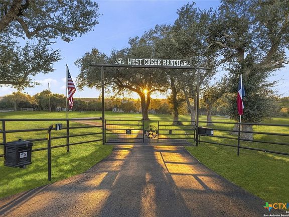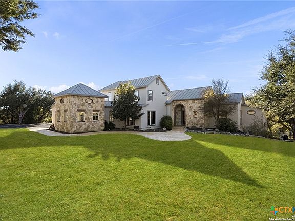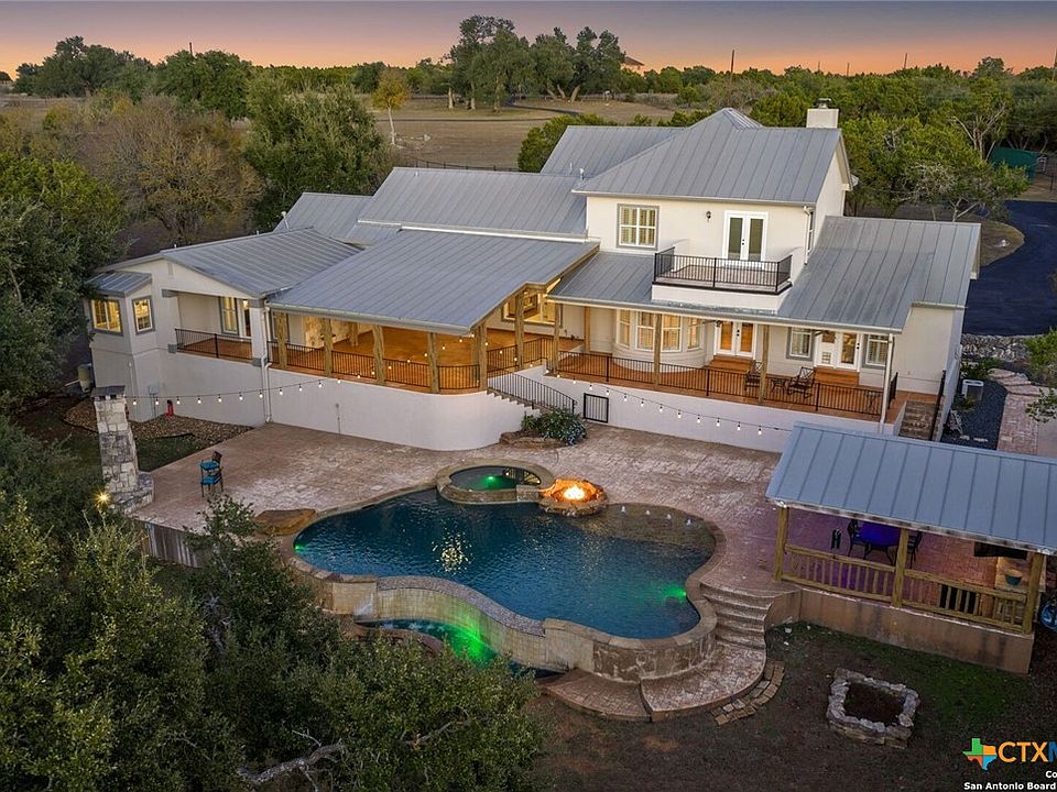 LUXURY, LAND AND LONGHORNS await you at this rare 15-acre Texas estate conveniently positioned between the quaint German town of New Braunfels, the gateway to the Hill Country town of Spring Branch, and just a short drive to Boerne, San Antonio, and Austin! This exquisite property includes a beautifully updated Tuscan-inspired farmhouse with a versatile floorplan and room for all. Memories with friends and family will be easy to create in this private Hill Country oasis with superb Texas sized living, land, storage and entertaining spaces. The spectacular outdoor oasis includes an infinity edge pool, multiple entertaining spaces accentuated with three fire features, and large covered outdoor kitchen area with all the essentials. Alfresco dining is ensured as the entire patio and pool area is surrounded by a flying insect repellant system with automatic timer. The inviting, 35,000 gallon heated, lagoon-style pool features a beach entry, bubblers, submerged bar seating, eight-foot diving end, fitness swim jets, infinity edge and adjoining extra deep spa with cascading water. The beautiful, curved staircase joins the upper and lower patio areas for ease of entertaining or enjoy the night sky as you stargaze from your second story terrace. The property has three distinct areas and is fenced and cross-fenced and ready for your livestock, or simply enjoy the herd of majestic longhorns that roam the neighborhood. The rear native portion offers a peaceful retreat with a seasonal creek and a historic stone wall originally built by German settlers to the area. The private well accesses the Edwards Aquifer Recharge Zone directly and has easily met this property's water needs. The 1250 square foot shop/barn set away from the home, showcases dual rolling overhead doors, epoxy flooring, and halogen lighting to easily accommodate your toys and equipment. Come tour this stunning property to truly appreciate all that it offers.